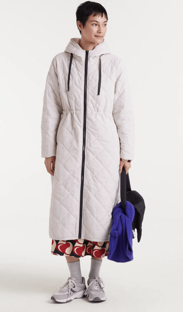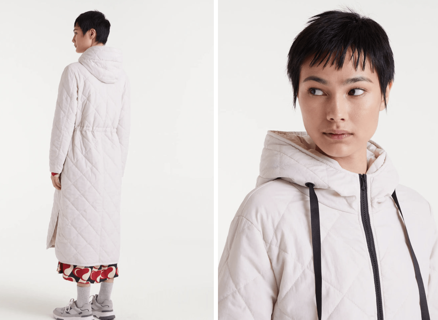 Abrigo con tejido acolchado de color blanco. Cuello alto con capucha ajustable y manga larga terminada en puño elástico. Cierre frontal con cremallera. Hombro ligeramente caído. Bolsillos laterales. Forro interior. La modelo mide 177 cm y lleva la talla S.