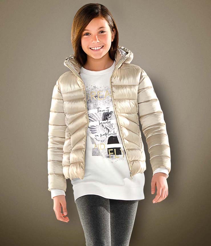 ABRIGO PARA NIÑA COLOR CHAMPAN CON BOLSILLOS Y CREMALLERA