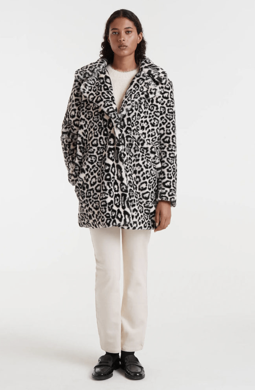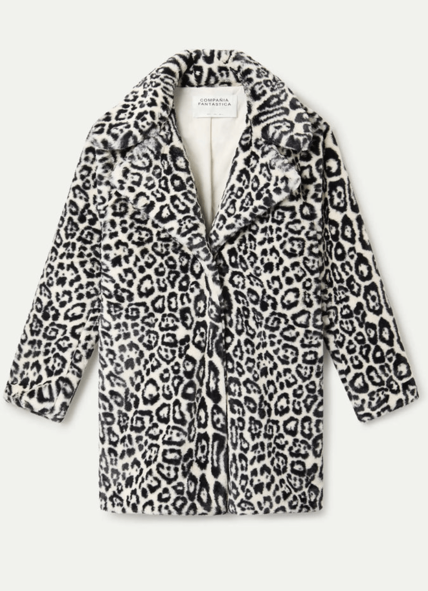 Abrigo de tejido faux fur con estampado animal print de color blanco. Cuello solapa y manga larga. Cierre frontal con botón oculto. Bolsillos laterales. La modelo mide 175 cm y lleva la talla S.