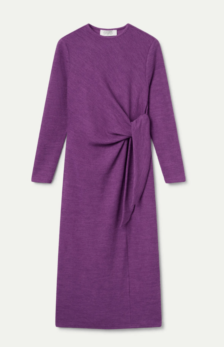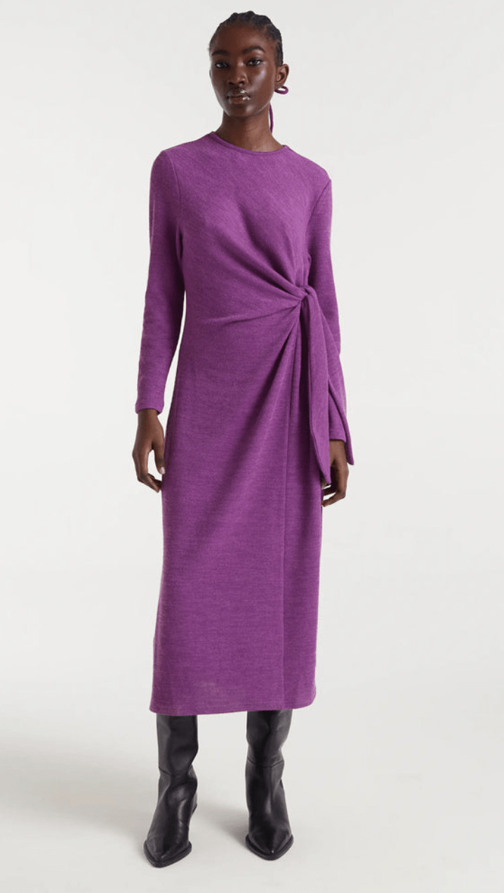 Vestido largo con tejido punto canalé de color magenta. Cuello redondo y manga larga. Hombro ligeramente caído. Detalle lazado lateral. La modelo mide 178 cm y lleva la talla S.
