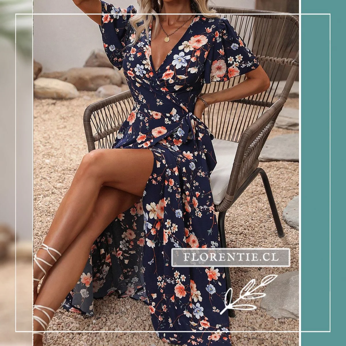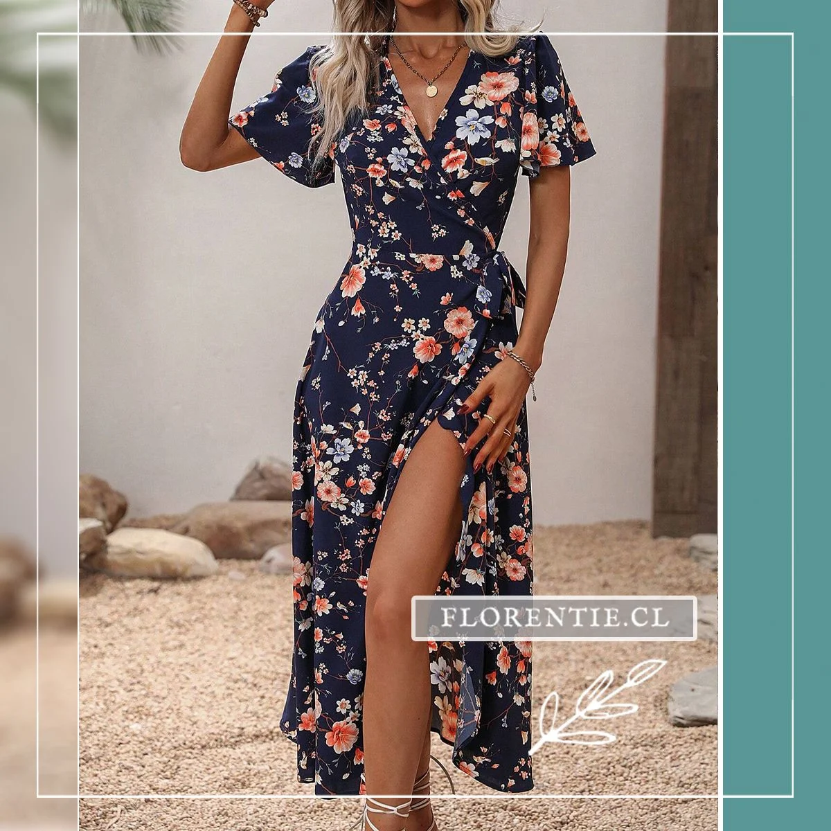 Vestido envolvente largo con estampado floral sobre fondo azul marino.